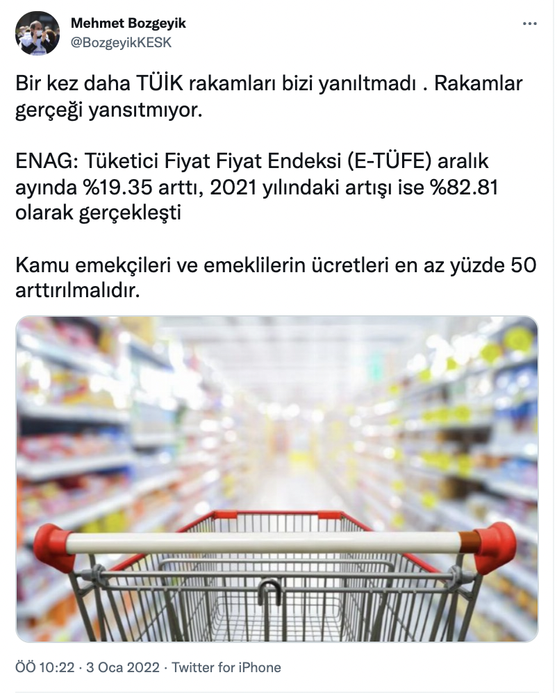 Kamu Emekçileri Sendikaları Konfederasyonu (KESK) Genel Başkanı Mehmet Bozgeyik, kişisel Twitter hesabında yaptığı değerlendirmelerde TÜİK rakamlarının bir kez daha kendilerini yanıltmadığını belirtti. "Rakamlar gerçeği yansıtmıyor" diyerek ENAG'ın yüzde 81,82 olarak açıkladığı enflasyon verilerine dikkati çekti.